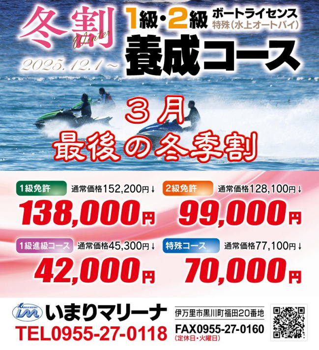 TEL:0955-27-0118 FAX:0955-27-0160 いまりマリーナ →アクセス 〒848-0122 佐賀県伊万里市黒川町福田20 つばきマリーナ →アクセス 〒848-0401 長崎県松浦市福島町喜内瀬免588-5